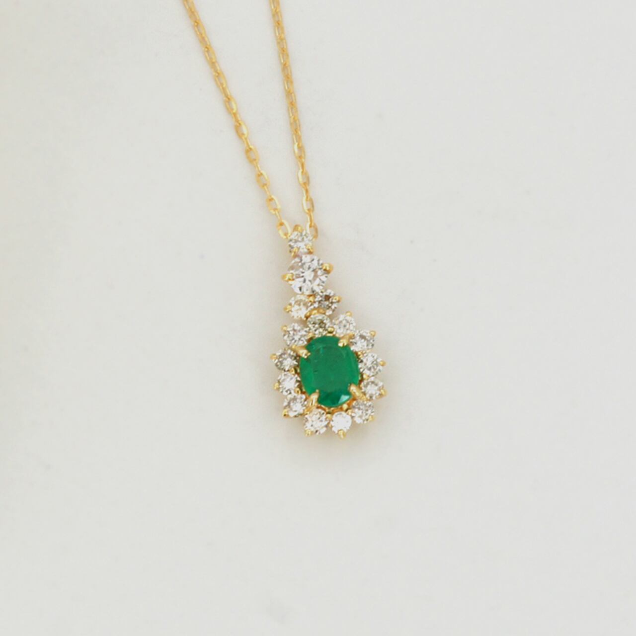 ダイヤモンドで取り巻かれたエメラルドが、ダイヤモンドの輝きと相まって、まるで宝石の花畑のような華やかさを演出します。特別な日や大切な人へのギフトにもぴったりな、小ぶりながらも存在感あふれるアイテムです。