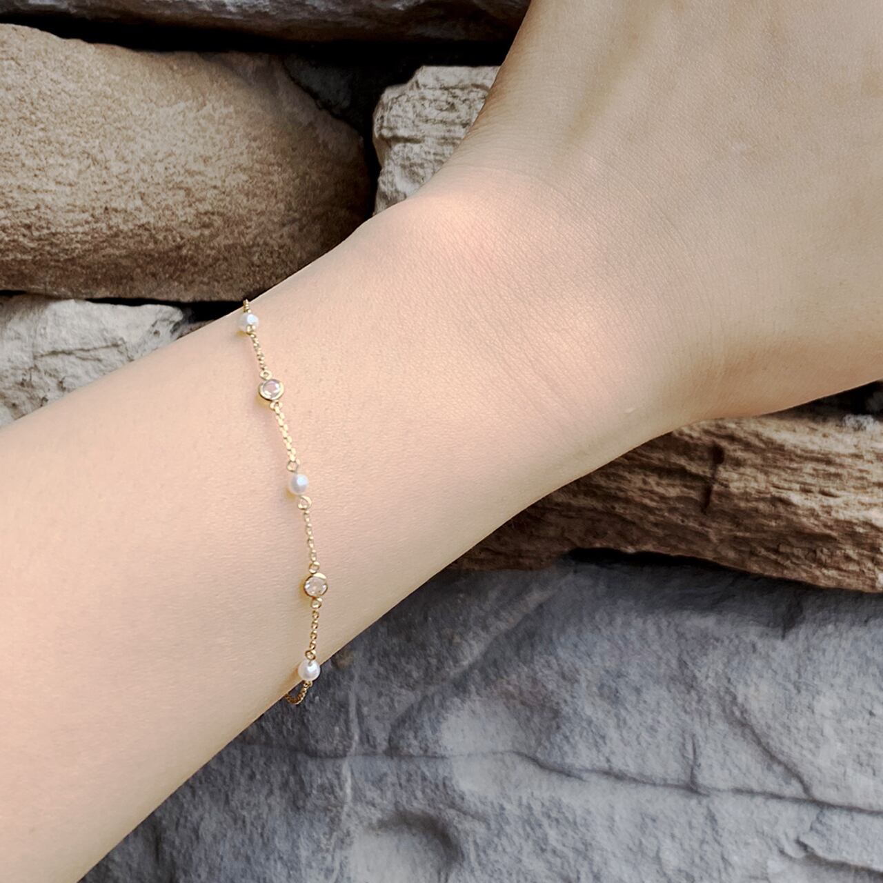 等間隔に並んだ丸いパールとブルームーンストーンが、手元を優しく彩り、華やかで爽やかな印象を与えてくれます。シンプルながらも存在感があり、普段使いから特別な日まで幅広くお楽しみいただけるデザインです。