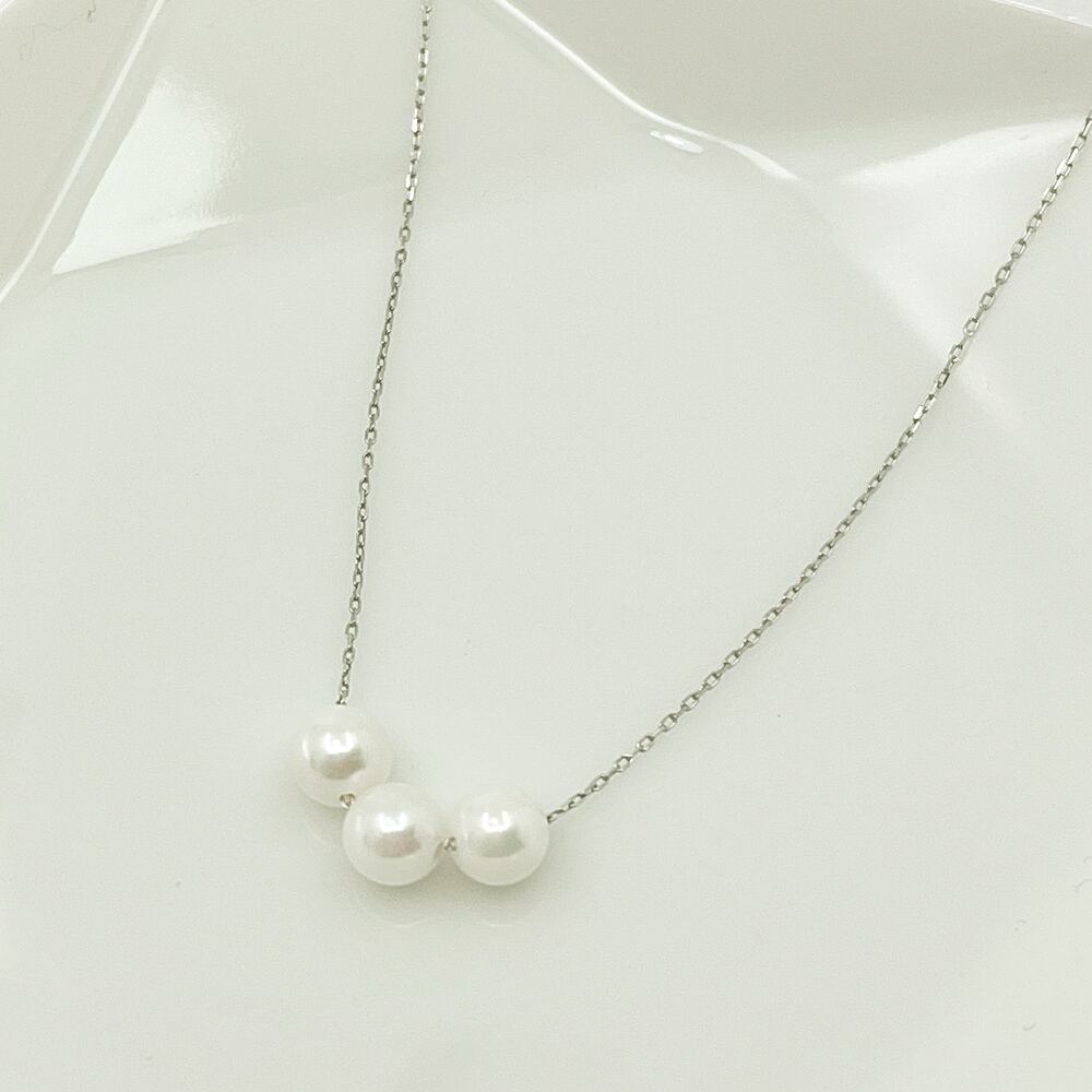 小ぶりながらも高級感あふれるベビーパールが、ネックラインに品格を添えます。