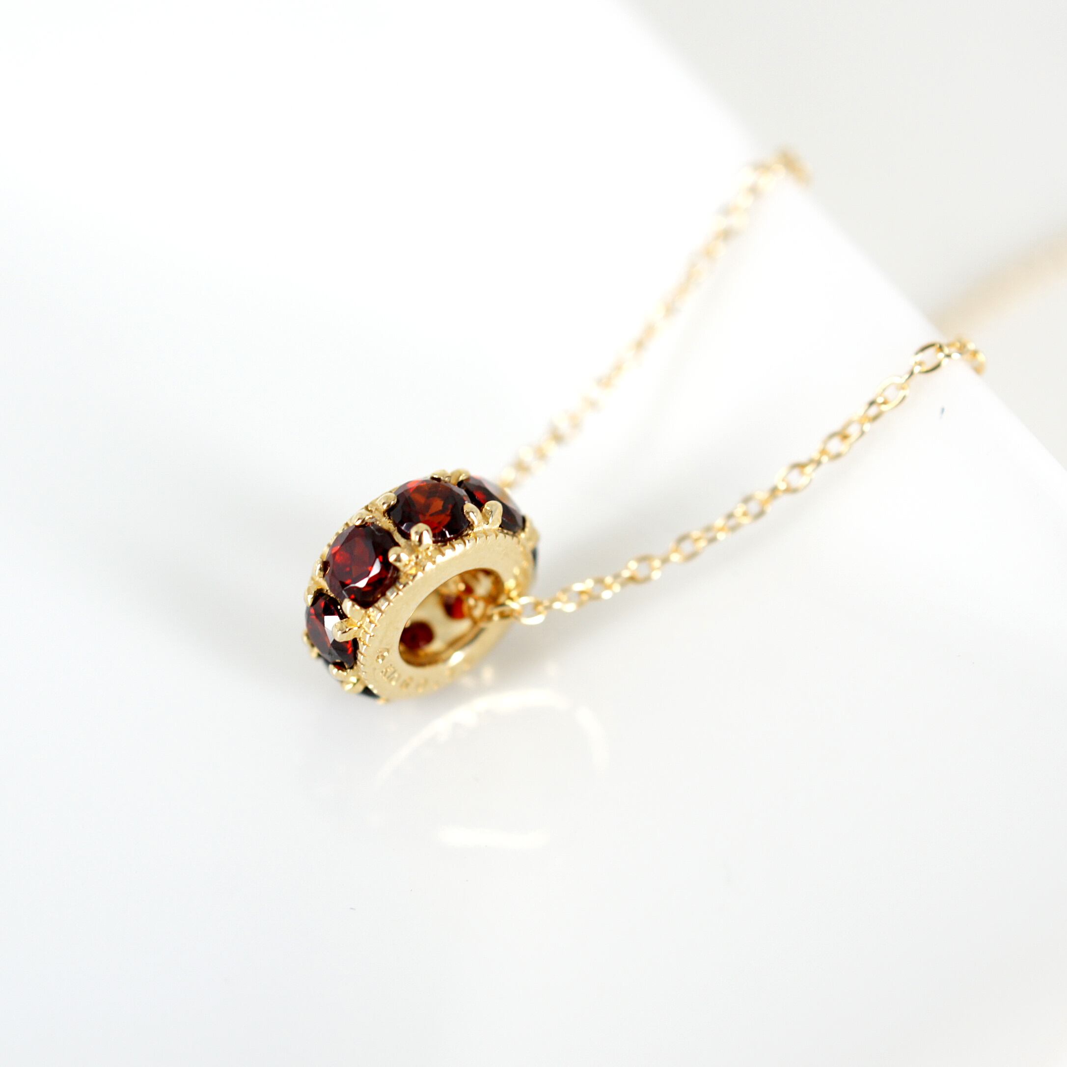 リング状のフォルムに全周にわたって8石のガーネットを留めています。
